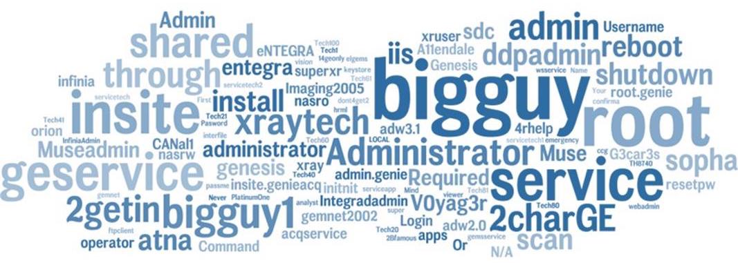Figure 1. One medical device manufacturer had 35 CVEs and 125-plus sets of exposed credentials. This word cloud, courtesy of Scott Erven, describes common default passwords from a single medical device manufacturer. Default passwords on cameras and other IoT devices enabled attackers to direct a tsunami of network traffic at Dyn. Similar default password risks exist for medical devices.